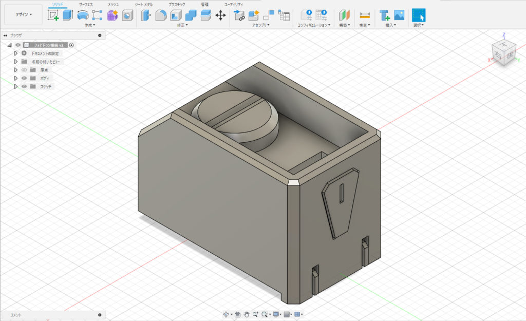 試しに出力した状態では、ダボ穴が緩かったので径を修正し、元のパーツの突起にひっかけて回転しないようにするミゾなどを追加したりしました。