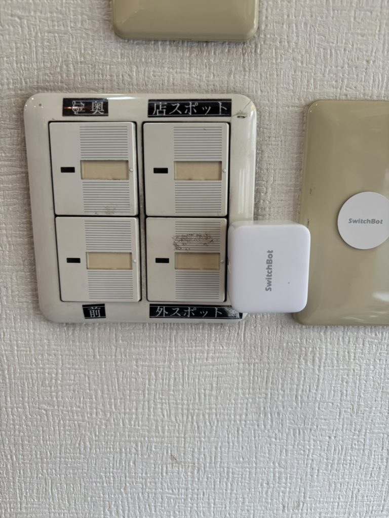 この店舗のスイッチでは、店外軒先に設置しているスポットライトのスイッチを押してもらっています。